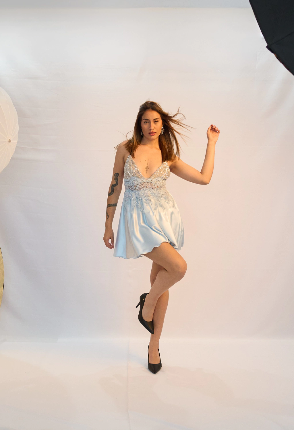 Perfecto para eventos especiales o salidas elegantes, no pierdas la oportunidad de lucir esta pieza excepcional y destacar con un estilo refinado y contemporáneo. ¡Haz que cada momento sea memorable con el Vestido Corto Mariela!